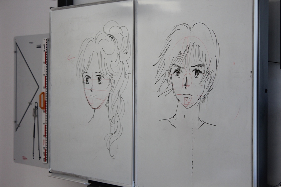 Nachdem wir uns und die Arbeit der Deutsch-Japanischen Gesellschaft Berlin vorgestellt haben, entwickelte sich nach der typischen, anfänglichen Unruhe im Kurs schnell eine produktive Arbeitsatmosphäre. Als wir den Kurs besuchten, versuchten sich die SchülerInnen gerade am Zeichnen von Gesichtern im Manga-Stil. Frau Tomita konnte dabei helfen, indem sie an der Tafel anhand von zwei Zeichnungen den Aufbau erklärte und wie man unter Nutzung von Hilfslinien die richtigen Proportionen und die richtige Perspektive findet.